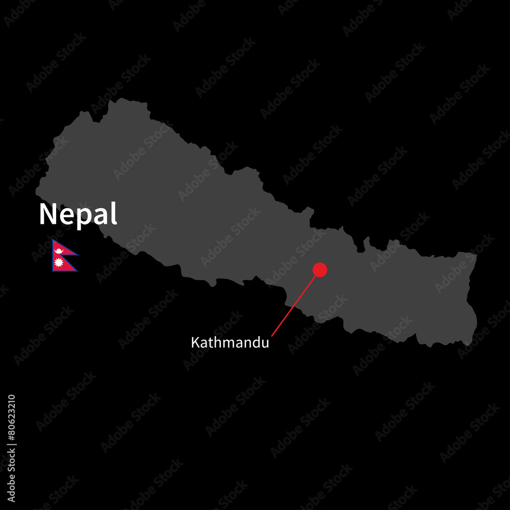 Detailed map of Nepal and capital city Kathmandu with flag on